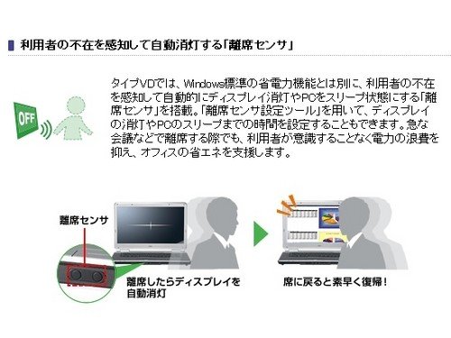日本的電子產品,向來在人性化設計上有獨到之處,就像這款NEC近期推出的新型號筆記本電腦——VersaPro タイプVD,除了配備的15.6英寸全高清液晶屏是一大買點之外,其搭載的名為“離席感應器”的小部件,也很有意思。