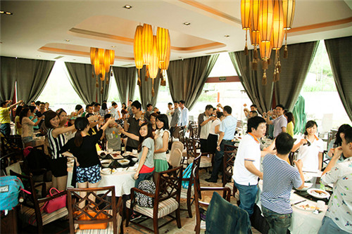 青山綠水、鳥語花香為伴的圣索亞酒店里面張燈結彩,節(jié)日氣氛份外濃烈,酒店的工作人員熱心的給我們布置了會場。