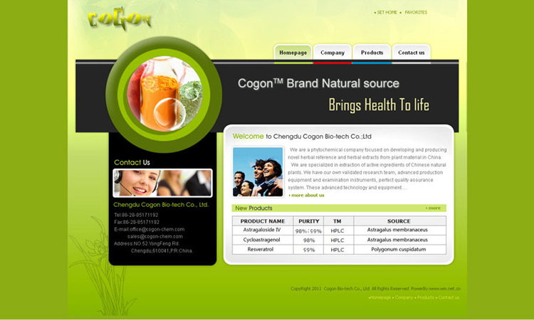 Welcome to Chengdu Cogon Bio-tech Co., Ltd. We are a phytochemical company focused on developing and producing novel herbal reference and herbal extracts from plant material in China. We are specialized in extraction of active ingredients of Chinese natural plants. We have our own validated research team, advanced production equipment and examination instruments, perfect quality assurance system. These advanced technology and equipment support quality multiple products. Guided by the principle of honesty and credibility, we have established good cooperative relationship with many companies. We sincerely like to establish friendly strategic partnerships with the enterprises all over the world for pioneering and market herbal products.