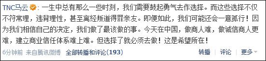馬云還表示,一生中總有那么一些時(shí)刻,需要鼓起勇氣去作選擇。而這些選擇不僅不符常理,違背理性,甚至離經(jīng)叛道得罪親友。“即便如此,我們可能還會(huì)一意孤行!因?yàn)槲覀兿嘈抛约旱臎Q定,我們做了最該做的事。今天在中國(guó),做商人難,做誠(chéng)信商人更難,建立商業(yè)信任體系難上難。但選擇了就必須去做!這是希望所在!”