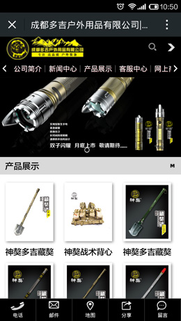 | 讓訪客將產品信息快速分享給他的好友,不論是微博還是QQ、人人還是開心、數十種途徑只要一點就能完成。 | 一鍵地圖定位,快速告訴你的訪客店面(公司)在哪里,自動導航,把訪客引到店里來。 | 訪客看到心儀的產品想要聯系企業?Mobile植入一鍵撥打功能,不必四處找電話號碼!一鍵撥打,溝通的事交給手機去做! | ||||||