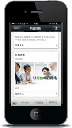 明騰網(wǎng)絡推出的微網(wǎng)站是將企業(yè)介紹,產(chǎn)品展示,服務項目,新聞動態(tài),營銷網(wǎng)絡,網(wǎng)上訂購,聯(lián)系方式等內(nèi)容通過企業(yè)微信展示出來,用戶只需要打開您的企業(yè)微信,就看到您的企業(yè)相關信息介紹,也能讓客戶體驗不一樣的企業(yè)微信展示,更加賞心悅目,提高客戶體驗,提升品牌形像,更好的服務客戶。