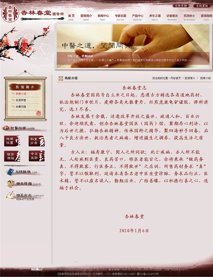 客戶概況:杏林春堂國藥號自立業(yè)之日起,悉遵古方精選各省道地藥材,依法炮制門市飲片,虔修各類丸散膏丹,灶煎虎鹿龜驢諸膠,擇料講究,選工盡善。杏林發(fā)展十余載,適逢改革開放之盛世,政通人和,百業(yè)興旺,余迎順民意,創(chuàng)辦杏林春堂國醫(yī)(國藥)館,冀期存心利濟(jì),以為后世之德,弘揚(yáng)杏林精神,傳承國粹之精華,聚四海妙手回春,啟八千良方濟(jì)世,救治患者之病痛,增進(jìn)攝生之調(diào)養(yǎng),提高生活之質(zhì)量。