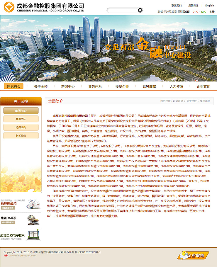 客戶概況:成都金融控股集團有限公司(原名:成都投資控股集團有限公司)是成都市委市政府為整合地方金融資源、提升地方金融機構競爭力的背景下,根據《成都市人民政府關于同意成都投資控股集團有限公司組建意見的批復》(成府函〔2008〕75號)文件精神,于2008年10月31日正式掛牌成立的成都市市屬大型國有企業,注冊資本金50億元,業務覆蓋銀行、證券、保險、擔保、小額貸款、融資租賃、典當、產業基金、創業投資、產權市場、資產經營、金融服務等多個領域。