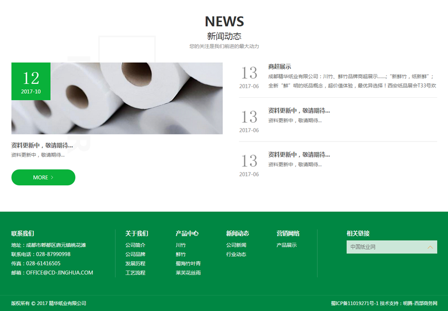 客戶概況:成都精華紙業有限公司成立于2005年11月,是由1995年注冊成立的“郫縣興達紙制品加工廠”更名而來;公司位于郫縣唐元鎮桃花灘工業區內,經過20多年的磨練,現已發展成為通過以商品竹漿板制造衛生紙,集研發、生產加工、銷售為一體的生活用紙專業公司。